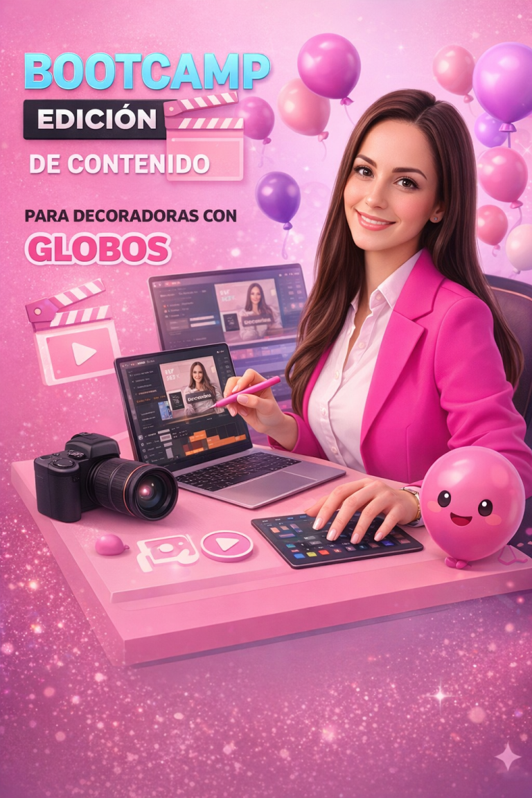 Un Bootcamp 100% práctico diseñado exclusivamente para decoradoras con globos que quieren dominar la edición de video como herramienta Estratégica de Crecimiento.